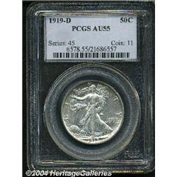 <B>1919-D<50C> AU55 PCGS.</B></I> Among the many wonderful coins in this sale is a Premium Gem MS66 example of this issue, along with two other Mint State coins. For the collector who just can't justify the money required to buy one of those coins, this Choice AU example is a wonderful alternative. This lightly circulated half dollar has considerable luster, mostly brilliant silver surfaces, and slightly reflective fields. The reverse has very faint gold toning. <BR><BR><B>Important notice:</B> Heritage usually auctions material at the rate of 200-250 lots per hour. On some occasions eBay Live bid software or the Internet may not be able to keep up with the pace of the auction. We recommend placing a realistic absentee bid now as insurance to avoid disappointment. Occasionally the auctioneer may eliminate or reject an eBay Live bid, and the auctioneer may also reopen a lot after the close of the eBay live bidding (usually because we missed an audience bid), and may reject your bid even if it shows you as the winning bidder. By bidding via eBay Live, you agree that Heritage may award the lot to another bidder at its sole discretion under the circumstances described above or any other reasonable circumstances. Since eBay bids are not shown to us until we open the lot on the floor, we treat those bids just like floor bids. In most cases the floor responds before the eBay bid is presented to us, due to Internet lag time, so for consistency we have made it a policy that floor bids are always considered first over tie eBay live bids. Also please note that all Heritage lots purchased through eBay Live carry a 20% Buyer's Premium. Please make sure you read the Terms and Conditions before you bid.