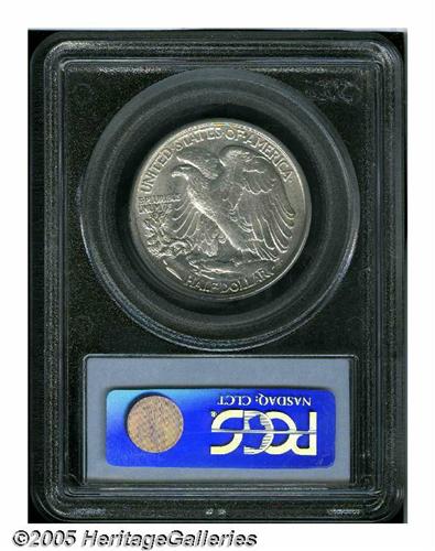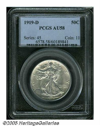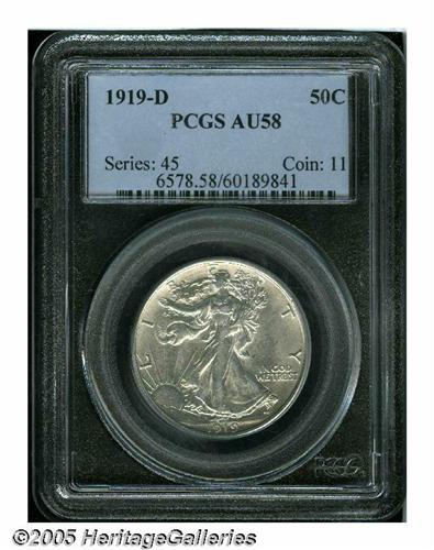 <B>1919-D<50C> AU58 PCGS.</B></I> A lightly toned key date Half Dollar with virtually complete mint luster. Light friction on the vertical highpoint of the obverse denies an Uncirculated grade, although the clean surfaces demonstrate eye appeal superior to that seen on many abraded Mint State pieces. The strike on Liberty's head, branch hand, and skirt lines is not complete, as expected for this conditionally rare issue.