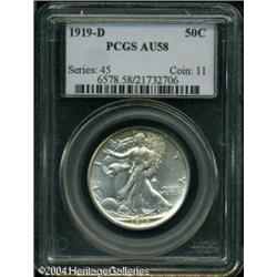 1919-D 50C AU58 PCGS. An untoned rare date Walker <B>1919-D 50C AU58 PCGS.</B></I> An untoned rare date Walker that has essentially complete mint luster and little evidence of friction on the major devices. The fields and devices are also pleasantly undisturbed, since only a very light diagonal pinscratch on Liberty's head is remotely worthy of mention. The rarity of Uncirculated 1919-D Halves is well known, and a lustrous, clean slider provides a worthy alternative. <BR><BR><B>Important notice:</B> Heritage usually auctions material at the rate of 200-250 lots per hour. On some occasions eBay Live bid software or the Internet may not be able to keep up with the pace of the auction. We recommend placing a realistic absentee bid now as insurance to avoid disappointment. Occasionally the auctioneer may eliminate or reject an eBay Live bid, and the auctioneer may also reopen a lot after the close of the eBay live bidding (usually because we missed an audience bid), and may reject your bid even if it shows you as the winning bidder. By bidding via eBay Live, you agree that Heritage may award the lot to another bidder at its sole discretion under the circumstances described above or any other reasonable circumstances. Since eBay bids are not shown to us until we open the lot on the floor, we treat those bids just like floor bids. In most cases the floor responds before the eBay bid is presented to us, due to Internet lag time, so for consistency we have made it a policy that floor bids are always considered first over tie eBay live bids. Also please note that all Heritage lots purchased through eBay Live carry a 20% Buyer's Premium. Please make sure you read the Terms and Conditions before you bid. This lot is being auctioned in conjunction with a live floor auction by Heritage Galleries & Auctioneers. All final auction and invoice information will be supplied by Heritage Galleries & Auctioneers, and all other information should be considered preliminary. Lot:6156