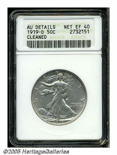 <B>1919-D<50C>--Cleaned--ANACS. AU Details, Net XF40.</B></I> Untoned and typically worn, for the grade, with somewhat subdued surfaces that reveal wispy hairlines in the fields, but are free of any large or serious marks.