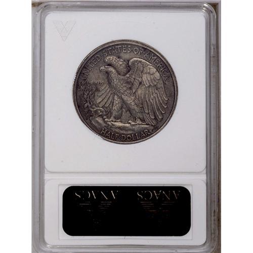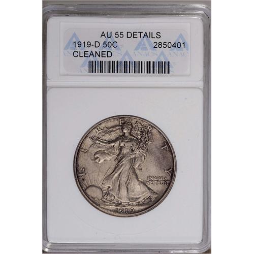 <B>1919-D<50C>--Cleaned--ANACS. AU55 Details.</B></I> Ample satin luster bathes this olive-gray semi-key Walking Liberty half. Impressively sharp, and the hairlines are subtle rather than obvious. Traces of copper-russet verdigris are noted along the eagle's neck and shoulder.