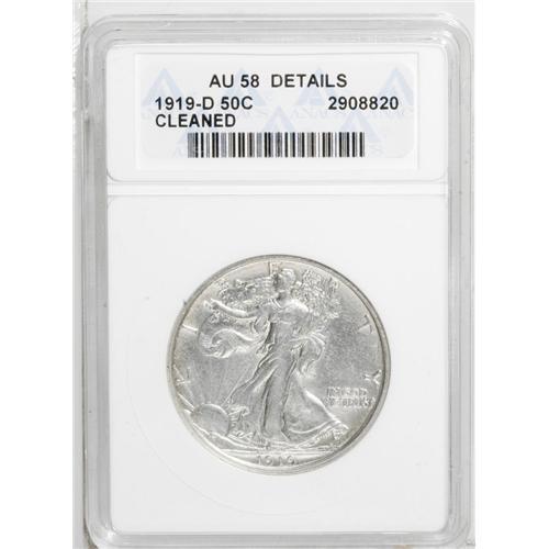 <B>1919-D<50C>--Cleaned--ANACS. AU58 Details.</B></I> Essentially untoned with virtually full design details and minimal surface blemishes, although a minor scrape is noted between the T and Y of Liberty. The fields are unnaturally bright from improper cleaning.