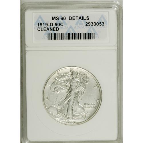 <B>1919-D 50C --Cleaned--ANACS. MS60 Details.</B></I> Suitably struck with no trace of wear. The pale pearl-gray surfaces have light hairlines and a slightly clouded, uniform appearance.<BR><I>From The Edward Sacks Collection.</B></I><BR><BR><b>Shipping:</b> Coins & Currency (<a target="_blank" href="http://www.heritageauctions.com/common/shipping.php">view shipping information</a>)
