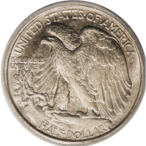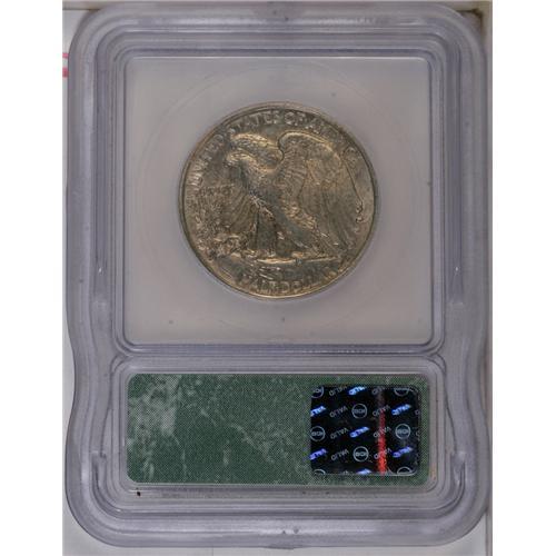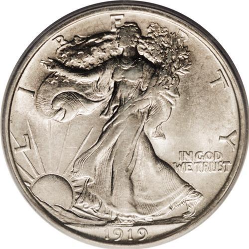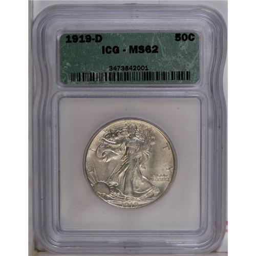 <B>1919-D<50C> MS62 ICG.</B></I> The 1919-D is a well known key to the Walking Liberty half dollar series in uncirculated grades, and is a notable strike rarity in addition to being a condition rarity. This satiny piece features a pale tan-gold cast to the obverse, with a slightly deeper tone to the reverse that tends towards bronze. The strike is well above average for the date, with most of Liberty's hand readily visible and good if not quite full definition on her head. A bit of weakness is noted along some of the letters in the periphery. Contact marks are curiously unobtrusive for the grade.<BR><I>From The Big Tex Registry Set of Walking Liberty Halves.</B></I>