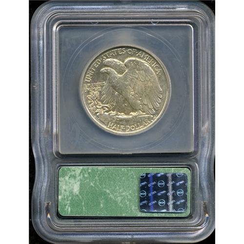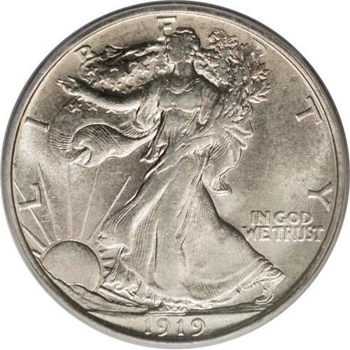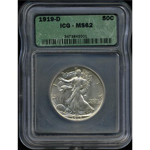 <B>1919-D 50C MS62 ICG.</B></I> The 1919-D is a well known key to the Walking Liberty half dollar series in uncirculated grades, and is a notable strike rarity in addition to being a condition rarity. This satiny piece features a pale tan-gold cast to the obverse, with a slightly deeper tone to the reverse that tends towards bronze. The strike is well above average for the date, with most of Liberty's hand readily visible and good if not quite full definition on her head. A bit of weakness is noted along some of the letters in the periphery. The feathers near 4 o'clock display a few wispy slide marks.<BR><BR><b>Shipping:</b> Coin/Currency (<a target="_blank" href="http://www.heritageauctions.com/common/shipping.php">view shipping information</a>)
