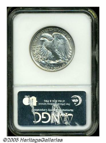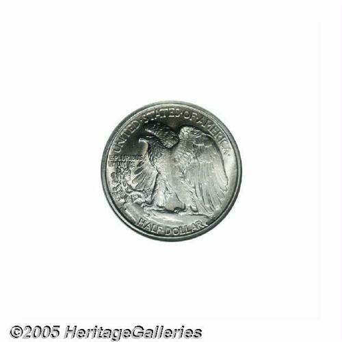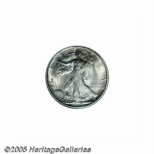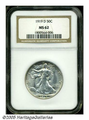 <B>1919-D<50C> MS62 NGC.</B></I> A typically struck example of this rarely seen, key date issue in the Walker series. As always, the head is weak, and there is also a noticeable lack of definition on the hand, upper skirt lines of Liberty, and the eagle's feathers on the left leg and in the juncture of the left wing with the torso. However, mint luster sparkles over both sides, and whispers of light tan patina visit the peripheries. What appear to be left over roller marks on the planchet are noted in the area where the eagle's left wing joins the breast. An important coin for the advanced collector of this popular series.