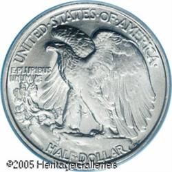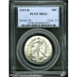 <B>1919-D 50C MS62 PCGS.</B></I> A pleasing example of this rarely seen, key date issue in the Walker series. As always, the head is softly struck and there is also a noticeable lack of definition on the hand, skirt lines of Liberty, and the eagle's feathers. However, full mint luster sparkles over both sides. An important coin for the advanced collector of this popular series. Lot:7966