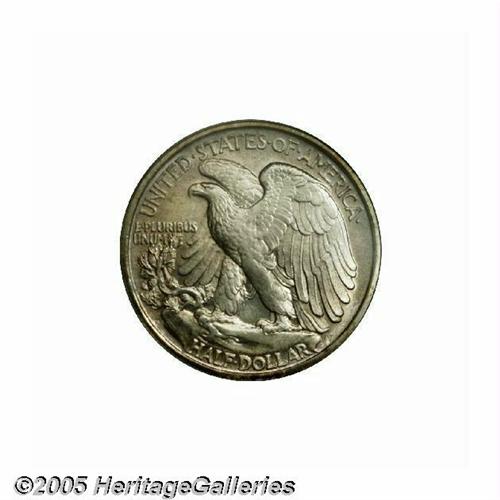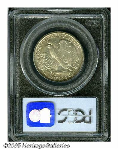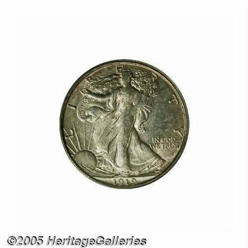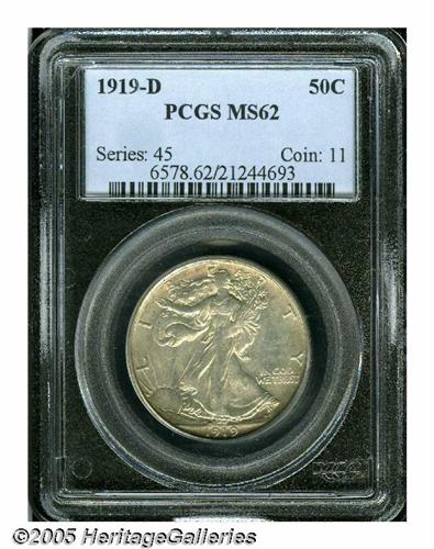 <B>1919-D<50C> MS62 PCGS.</B></I> A pleasing example of this rarely seen, key date issue in the Walker series. As always, the head is softly struck and there is also a noticeable lack of definition on the hand and skirt lines of Liberty. However, full mint luster lies beneath the light peach-gray patina that covers both sides. An important coin for the advanced collector of this popular series.
