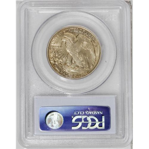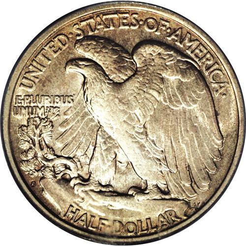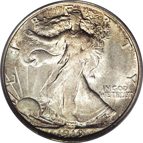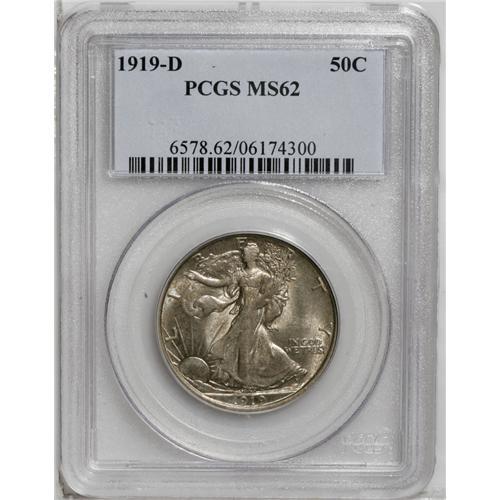 <B>1919-D<50C> MS62 PCGS.</B></I> Few coins meet the definition of "condition rarity" as well as the 1919-D Walking Liberty half. A difficult coin in any grade, the number of available examples drops precipitously as the grade rises, even in XF and AU. Mint State coins are scarce in all grades, with demand far outstripping the supply of the 1919-D in this popular series.<BR> This piece is one of the few Mint State 1919-D half dollars available to collectors of early Walkers. It has lovely satiny luster and great toning: violet-lavender and reddish-gold on the obverse, champagne and orange on the reverse. The surfaces are largely free of distracting marks, but this issue's bugbear, strike, limits the grade, as the central devices are flat and Liberty's hand is absent. Still, this is a desirable example of a popular, elusive, and challenging issue.