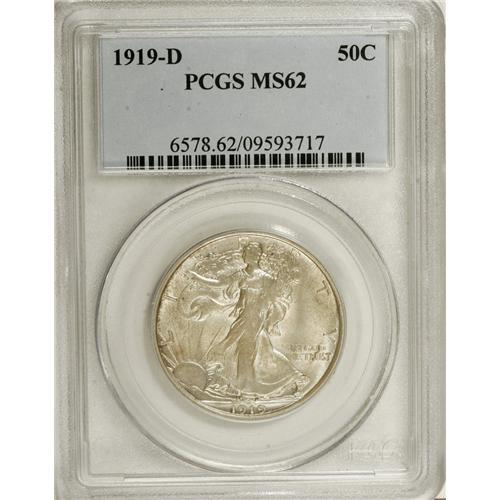 <B>1919-D 50C MS62 PCGS.</B></I> The rarest issue in the series in Gem condition with a full strike, or perhaps even nonexistent. This piece shows the typical flat strike through the center, with light roller marks visible in the unstruck areas on each side. On more positive notes, the hazy, smoke-gray surfaces show few mentionable abrasions, large or small, and somewhat muted luster radiates from both sides.<BR><BR><b>Shipping:</b> Coins & Currency (<a target="_blank" href="http://www.heritageauctions.com/common/shipping.php">view shipping information</a>)