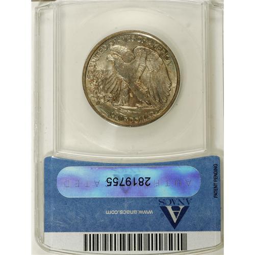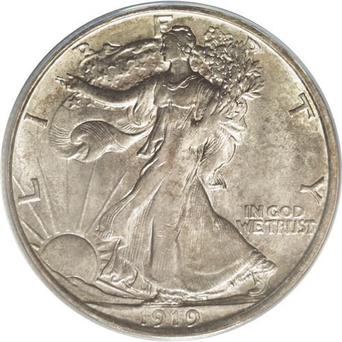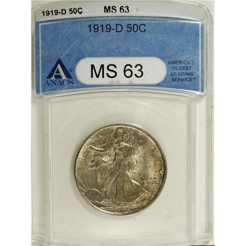 <B>1919-D 50C MS63 ANACS.</B></I> Though a number of issues have lower original mintages than the 1919-D Walker, this early branch mint half is one of the undisputed keys in Mint State, largely because few individuals saved examples from the production of 1.165 million pieces. Even MS63 pieces are conditionally scarce, and with many of the best examples firmly locked away in long-term collections, such pieces are even more elusive on the open market.<BR> The surfaces of this Select representative display lovely blue-green, sage, and rose patina. Strongly lustrous beneath the toning with the usual softness at Liberty's head and hand and the eagle's breast and leg, though Liberty's face displays discernible detail. A pair of light abrasions at Liberty's lower forward leg define the grade. Despite the typical definition and marks, this piece displays better visual appeal than the majority of examples and would make a desirable addition to a similarly graded set.<BR><BR><b>Shipping:</b> Coins & Currency (<a target="_blank" href="http://www.heritageauctions.com/common/shipping.php">view shipping information</a>)