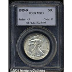 <B>1919-D<50C> MS63 PCGS.</B></I> The 1919-D and 1921-S are the two key issues to the Walking Liberty Half series. The '19-D is very elusive in XF and better condition with strictly Uncirculated examples a rare opportunity for the Half Dollar specialist. The lack of complete striking details (as seen on this piece) is a consistent problem on this issue. The only coin that was ever reported to have complete definition was seen many years ago by the late James Pryor (identifiable by a circular dig on the head of Liberty). This piece shows the usual softness of strike on the highest portions of the design, and there are no distracting abrasions on either side. Somewhat lackluster for consideration at a higher grade level, the surfaces are very lightly toned, and in fact, at a glance present as a brilliant.<BR><I>From The Dr. Frank Lanza Collection of Walking Liberty Half Dollars.</B></I> <BR><BR><B>Important notice:</B> Heritage usually auctions material at the rate of 200-250 lots per hour. On some occasions eBay Live bid software or the Internet may not be able to keep up with the pace of the auction. We recommend placing a realistic absentee bid now as insurance to avoid disappointment. Occasionally the auctioneer may eliminate or reject an eBay Live bid, and the auctioneer may also reopen a lot after the close of the eBay live bidding (usually because we missed an audience bid), and may reject your bid even if it shows you as the winning bidder. By bidding via eBay Live, you agree that Heritage may award the lot to another bidder at its sole discretion under the circumstances described above or any other reasonable circumstances. Since eBay bids are not shown to us until we open the lot on the floor, we treat those bids just like floor bids. In most cases the floor responds before the eBay bid is presented to us, due to Internet lag time, so for consistency we have made it a policy that floor bids are always considered first over tie eBay live bids. Also please note that all Heritage lots purchased through eBay Live carry a 20% Buyer's Premium. Please make sure you read the Terms and Conditions before you bid. </span></font></tr></table></td></tr></table>