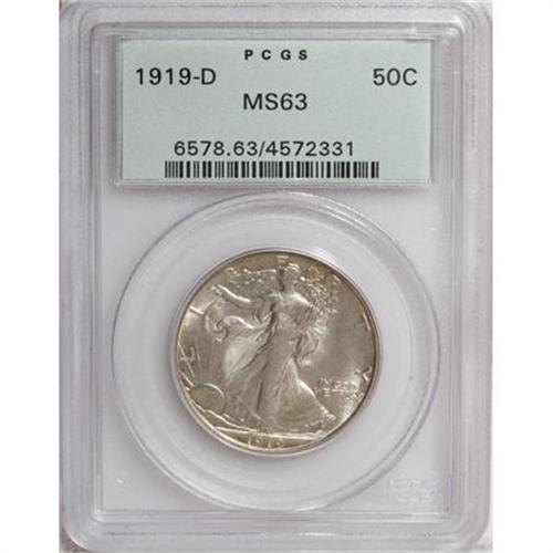 <B>1919-D 50C MS63 PCGS.</B></I> There is little doubt that the 1919-D half dollar is the rarest date in the entire Walking Liberty half dollar series in Mint State grades. It is also one of the most poorly struck issues in the entire series, and perhaps this accounts for its Mint State rarity. Even a brief period in circulation, not enough to actually exhibit any wear on fully struck pieces, could give a poorly struck coin the appearance of considerable wear.<BR> This piece, in a green-label holder, exhibits considerable strike weakness at the center on each side, and also at Liberty's head. Both sides are fully lustrous with light champagne toning that deepens slightly near the borders.<BR><BR><b>Shipping:</b> Coins & Currency (<a target="_blank" href="http://www.heritageauctions.com/common/shipping.php">view shipping information</a>)