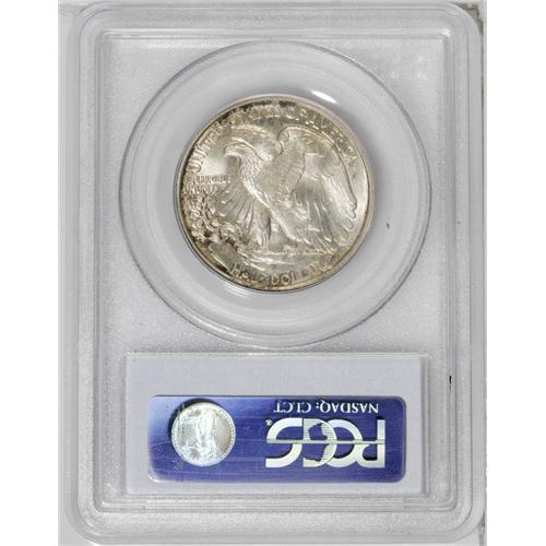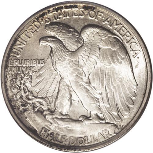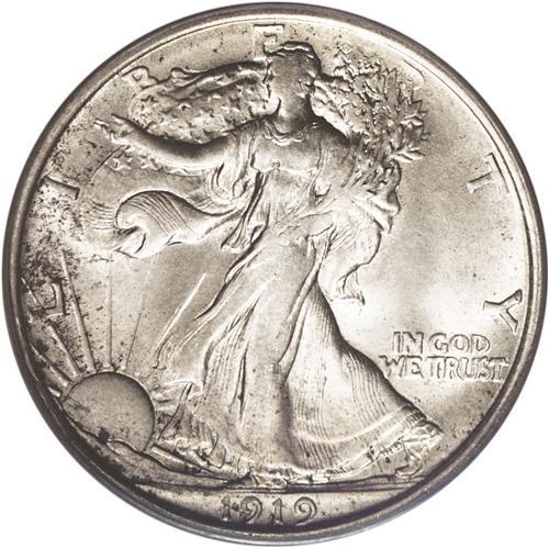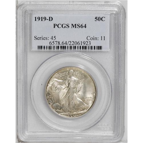<B>1919-D<50C> MS64 PCGS.</B></I> In near-Gem condition, the 1919-D and '21-S are the two foremost keys in the widely collected Walking Liberty half series, and a strong case could be made for placing this issue at the top of the list. Aside from the fact that the supply of '19-D Walkers at the Mint State level is extremely limited, the single greatest deterrent in locating a Choice or better example is the tell-tale weakness of strike, especially on the hand and head area of the obverse, that seems common to virtually all 1919-D half dollars.<BR> On this extraordinary example, Liberty's right (facing) hand is essentially complete and the head detail, is a trifle mushy, being typically defined as virtually all Uncirculated pieces seen by this cataloger. The luster of this coin parallels the remarkable strike, being intense throughout with the barest trace of golden color that deepens to mottled charcoal at selected border areas. Magnification is required to locate a few unobtrusive blemishes on the central devices and in the right obverse field. A serious collector of Walking Liberty half dollars might search for years and not find a finer 1919-D than the amazing near-Gem offered here. Population: 73 in 64, 11 finer (7/06).