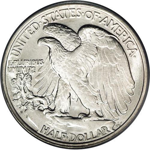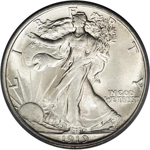 <B>1919-D<50C> MS64 PCGS.</B></I> The 1919-D is an unquestioned rarity in the Walking Liberty series. Although it has not achieved the illustrious status of the 1921 issues, for example, dedicated collectors of this series recognize its importance and place a high premium on well struck pieces such as the present example. This lustrous coin is silver-white, with a hint of faint gold on the obverse. There is minor weakness on the head of Liberty, as seen on nearly all examples of this date. The strike is better than usual: Liberty's thumb is clearly outlined over her dress, and the skirt lines are bold. The surfaces are delightful, with no distracting abrasions. One minor nick, below the L in LIBERTY on the sun's rays, will serve to identify this coin, along with a couple of ticks on the eagle's upper left (facing) wing. There is minor doubling on the mintmark and some of the peripheral letters and devices. A collector who has long sought an attractive and appealing example of this issue should consider the present coin seriously, as it has a better than average strike, few faults, and great eye appeal for the grade. Population: 71 in 64, 11 finer (1/06).