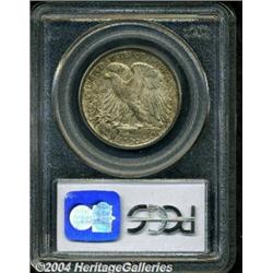 <B>1919-D<50C> MS64 PCGS.</B></I> The 1919-D and '21-S are the two foremost keys in the widely collected Walking Liberty half series. A problem that seems common to virtually all 1919-D halves is that of weakness of strike, especially on the hand and head area of the obverse. Surprisingly, the hand is fully brought up on this coin and the head detail is nearly complete. From the standpoint of strike, this coin is unexcelled in our experience. Both sides are moderately toned with argent-gray and mottled russet patina, satiny underlying luster, and no singularly mentionable abrasions. A conditionally rare, key date coin with extraordinary striking definition. Population: 56 in 64, 11 finer (3/04). <BR><BR><B>Important notice:</B> Heritage usually auctions material at the rate of 200-250 lots per hour. On some occasions eBay Live bid software or the Internet may not be able to keep up with the pace of the auction. We recommend placing a realistic absentee bid now as insurance to avoid disappointment. Occasionally the auctioneer may eliminate or reject an eBay Live bid, and the auctioneer may also reopen a lot after the close of the eBay live bidding (usually because we missed an audience bid), and may reject your bid even if it shows you as the winning bidder. By bidding via eBay Live, you agree that Heritage may award the lot to another bidder at its sole discretion under the circumstances described above or any other reasonable circumstances. Since eBay bids are not shown to us until we open the lot on the floor, we treat those bids just like floor bids. In most cases the floor responds before the eBay bid is presented to us, due to Internet lag time, so for consistency we have made it a policy that floor bids are always considered first over tie eBay live bids. Also please note that all Heritage lots purchased through eBay Live carry a 20% Buyer's Premium. Please make sure you read the Terms and Conditions before you bid.