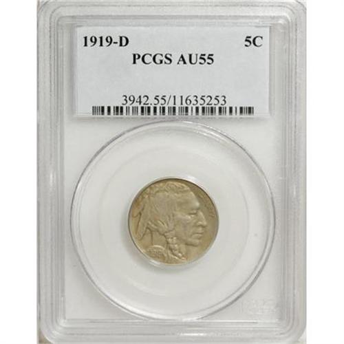 <B>1919-D 5C AU55 PCGS.</B></I> PCGS Population (26/427). NGC Census: (24/290). Mintage: 8,006,000. Numismedia Wsl. Price for NGC/PCGS coin in AU55: $275. (#3942)<BR><BR><B>Coin Engraver:</B> James E. Fraser<BR><BR><b>Shipping:</b> Coins & Currency (<a target="_blank" href="http://www.heritageauctions.com/common/shipping.php">view shipping information</a>\)