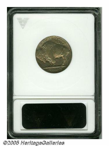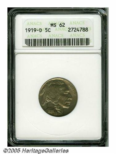 <B>1919-D<5C> MS62 ANACS.</B></I> The 1919-D is a noteworthy scarcity in the Buffalo Nickel series, both in terms of availability in Mint State and from a strike perspective. The strike on this specimen is somewhat above average, with fairly bold definition apparent on the peripheral lettering and date. Some softness is noted on portions of the bison's head and shoulder. The surfaces are golden-gray, ice-blue, and magenta. A small planchet flake is noted on the obverse rim at 8 o'clock.