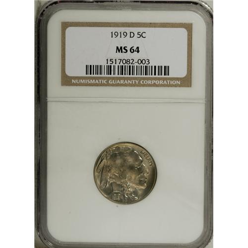 <B>1919-D 5C MS64 NGC.</B></I> A frosty near-Gem with excellent luster beneath light gold toning. This example is more sharply struck than typical for the date.<BR><BR><b>Shipping:</b> Coin/Currency (<a target="_blank" href="http://www.heritageauctions.com/common/shipping.php">view shipping information</a>)