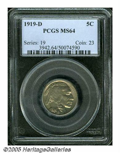 <B>1919-D<5C> MS64 PCGS.</B></I> Extremely lustrous with splashes of delicate golden patina here and there, being endowed with a strike that is much sharper than is normally encountered on the '19-D. A top notch Gem example of this well known scarcity among Buffalo Nickels. Population: 163 in 64, 59 finer (6/05).