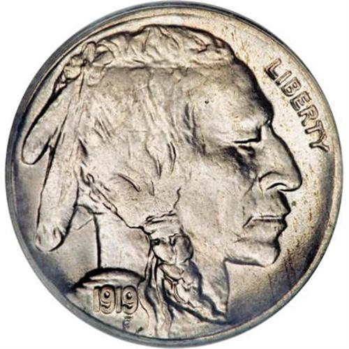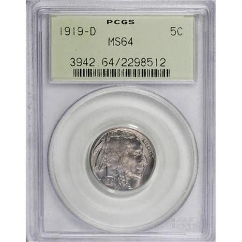 <B>1919-D 5C MS64 PCGS.</B></I> A good strike with only slight blending of detail in the centers and on the bison's hair. Light golden-brown and ice-blue toning graces the smooth and highly lustrous surfaces. LIBERTY and the date are strike doubled. Housed in an old green label holder.<BR><BR><B>Coin Engraver:</B> James E. Fraser<BR><BR><b>Shipping:</b> Coins & Currency (<a target="_blank" href="http://www.heritageauctions.com/common/shipping.php">view shipping information</a>)