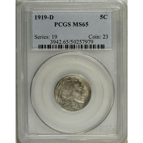 <B>1919-D 5C MS65 PCGS.</B></I> Even among the relatively few Gem survivors of this sought-after Denver issue, at least a modest degree of softness can be expected on the highpoints of the design. Such is the nature of the 1919-D, one of the many branch mint issue from the teens and twenties with striking deficiencies. This solid Gem breaks all the rules when it comes to strike, being remarkably bold in all areas. Both sides display a lovely, frosted sheen and are tinted in delicate golden and steel-blue patina. Population: 52 in 65, 13 finer (12/06).<BR><BR><b>Shipping:</b> Coin/Currency (<a target="_blank" href="http://www.heritageauctions.com/common/shipping.php">view shipping information</a>)