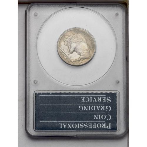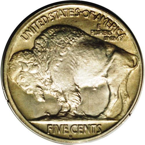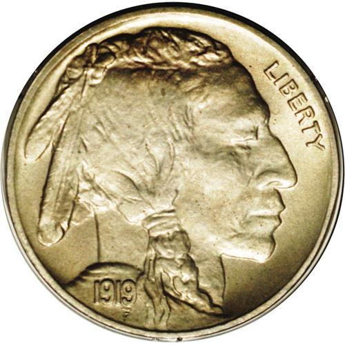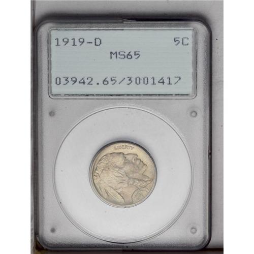 <B>1919-D<5C> MS65 PCGS.</B></I> This beautiful Gem example is overlaid in moderate reddish-gold and gray-green toning and is particularly well struck on the obverse. The foremost part of the bison's head is a bit flat, as almost always seen, but the horn detail is complete and the balance of the reverse is uncommonly sharp. A few minor carbon flecks are noted, but these hardly detract. Housed in a first generation PCGS holder.