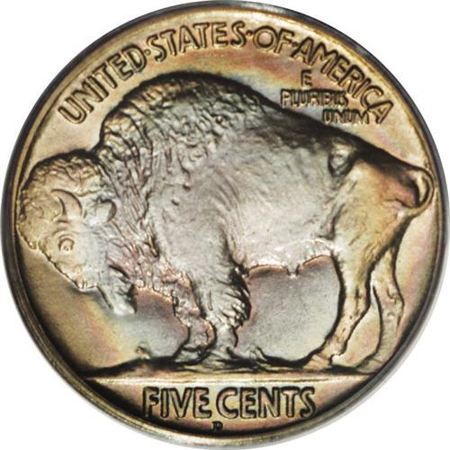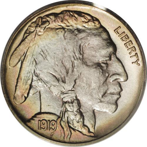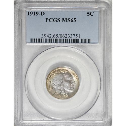 <B>1919-D 5C MS65 PCGS.</B></I> Unusually fine target toning is displayed on each side. Gold, crimson, and green iridescence adorns the peripheries, while the centers exhibit attractive shades of blue and rose. This piece is sharply struck and well preserved, lacking any noticeable distractions or mint-made anomalies. One of the most difficult Buffalo nickel issues to find well struck, according to David Lange. Population: 52 in 65, 13 finer (12/06).<BR><BR><b>Shipping:</b> Coin/Currency (<a target="_blank" href="http://www.heritageauctions.com/common/shipping.php">view shipping information</a>)