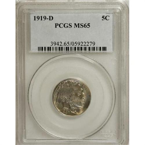 <B>1919-D 5C MS65 PCGS.</B></I> Although not generally thought of in the same league with the S-mint series keys, the 1919-S is a difficult issue in its own right. Lange calls the issue "one of the last holes filled by a discriminating collector, regardless of whether one is collecting XF-AU or gem uncirculated." This charming Gem offers charming, lightly toned hazel-olive surfaces with accents of rose-copper, with a bold strike and excellent eye appeal.<BR><BR><B>Coin Engraver:</B> James E. Fraser<BR><BR><b>Shipping:</b> Coins & Currency (<a target="_blank" href="http://www.heritageauctions.com/common/shipping.php">view shipping information</a>\)