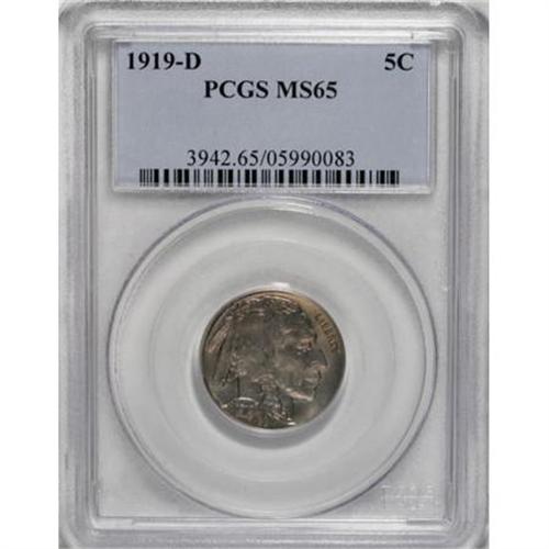 <B>1919-D 5C MS65 PCGS.</B></I> The 1919-D and 1919-S Buffalo nickels rank among condition rarities in the series. This specimen has unusually sharp design details, and a curious rim break along the left obverse border. The surfaces have satiny luster with pleasing lilac and gold color. Population: 54 in 65, 13 finer (8/07).<BR><BR><B>Coin Engraver:</B> James E. Fraser<BR><BR><b>Shipping:</b> Coins & Currency (<a target="_blank" href="http://www.heritageauctions.com/common/shipping.php">view shipping information</a>)