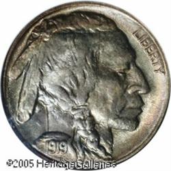 <B>1919-D 5C MS66 NGC.</B></I> The 1919-D is a noteworthy scarcity in the Buffalo Nickel series, both in terms of availability in Mint State and from a strike perspective. This beautifully toned representative is endowed with especially bold definition over the major design elements and is layered in orange and steel-blue shades. A nearly unsurpassable example of this prized D-mint Buffalo. Population: 2 in 66, 0 finer (1/05). Lot:5981