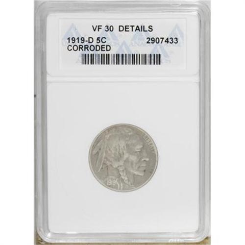 <B>1919-D 5C --Corroded--ANACS. VF 30 Details.</B></I> NGC Census: (17/389). PCGS Population (10/542). Mintage: 8,006,000. Numismedia Wsl. Price for NGC/PCGS coin in VF30: $126. (#3942)<BR><BR><B>Coin Engraver:</B> James E. Fraser<BR><BR><b>Shipping:</b> Coins & Currency (<a target="_blank" href="http://www.heritageauctions.com/common/shipping.php">view shipping information</a>)