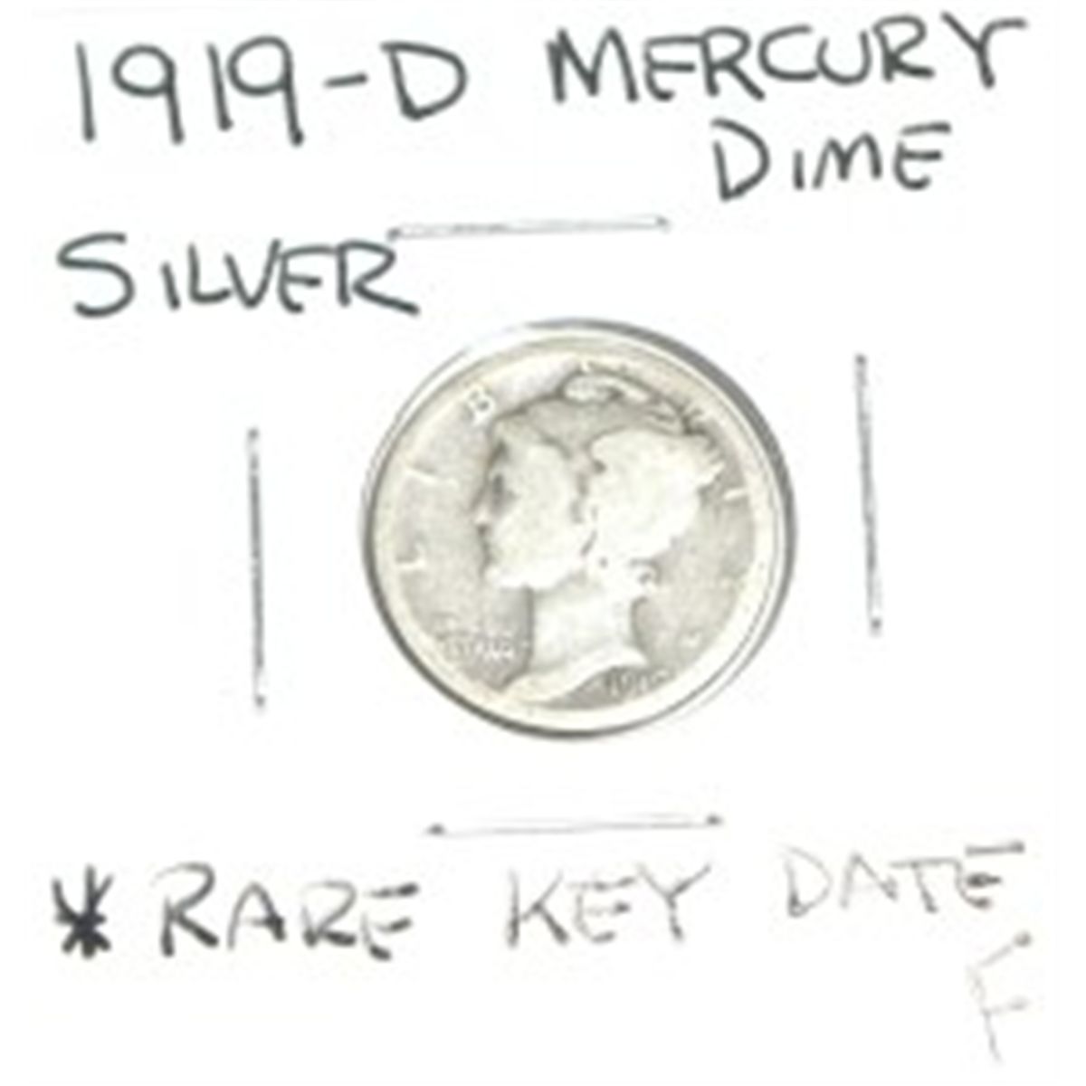 1919-D Mercury Silver Dime *RARE KEY DATE FINE GRADE*!! ***Coin & Currency Grades, Conditions and Values are not Northern Colorado Estate Liquidators Responsibilty. Grades, Condition and Values are determined by Consigner(s) & Buyers ONLY***