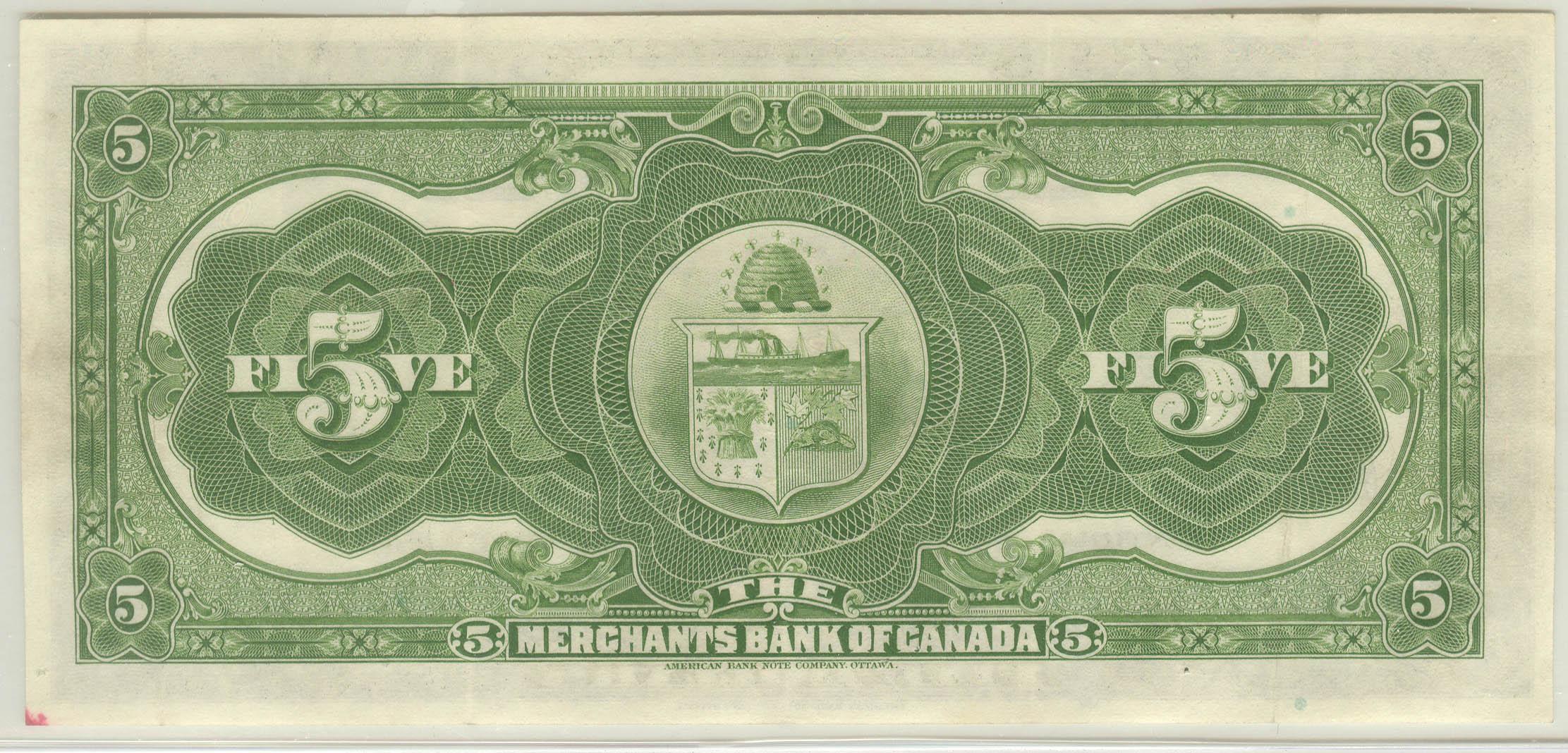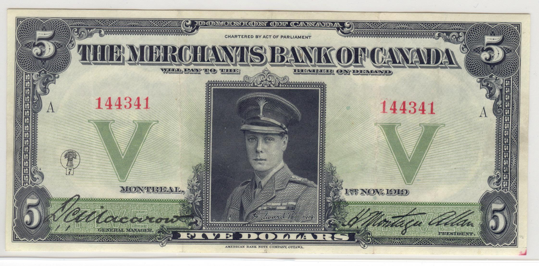 1919 Five Dollars Merchants Bank of Canada, CCGS VF-30, CH 460-22-02, Macarow Allan, serial 144341, Ink Corner Tip.