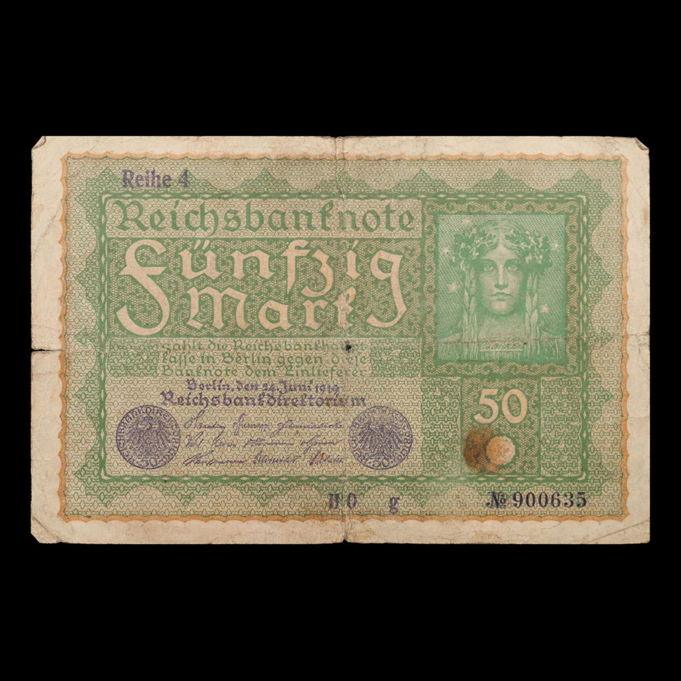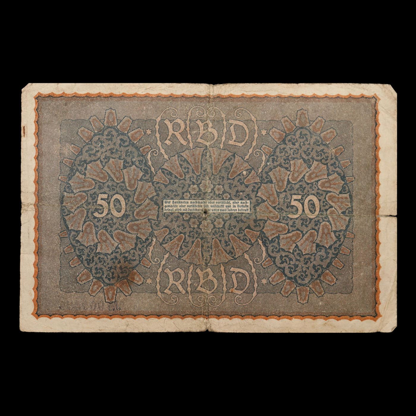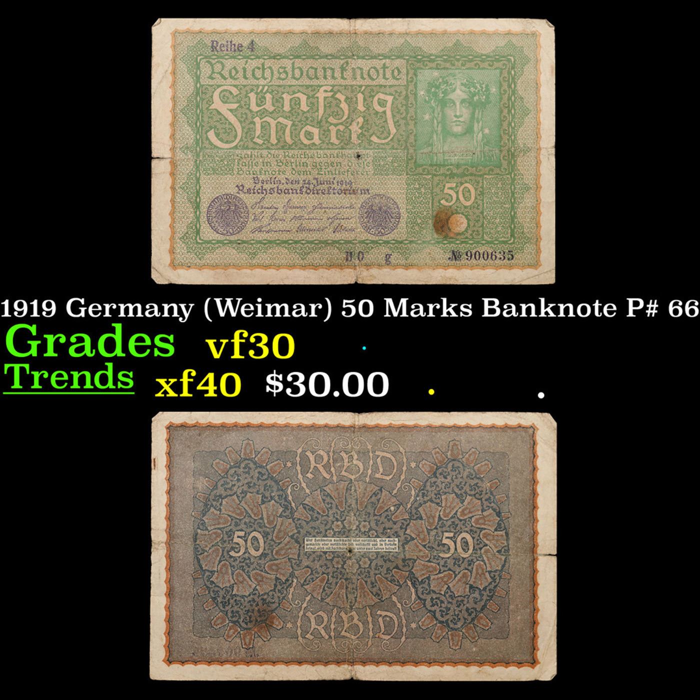 1919 Germany (Weimar) 50 Marks Banknote P# 66 Grades vf++. In August 1914, Directly after the onset of WW1, the German Empire removed the gold backing of the mark and issued new currency. After the fall of the German Empire in 1918, the newly formed German Weimar Republic issued another new currency, known derisively as the "Paper Mark", which faced massive hyperinflation.