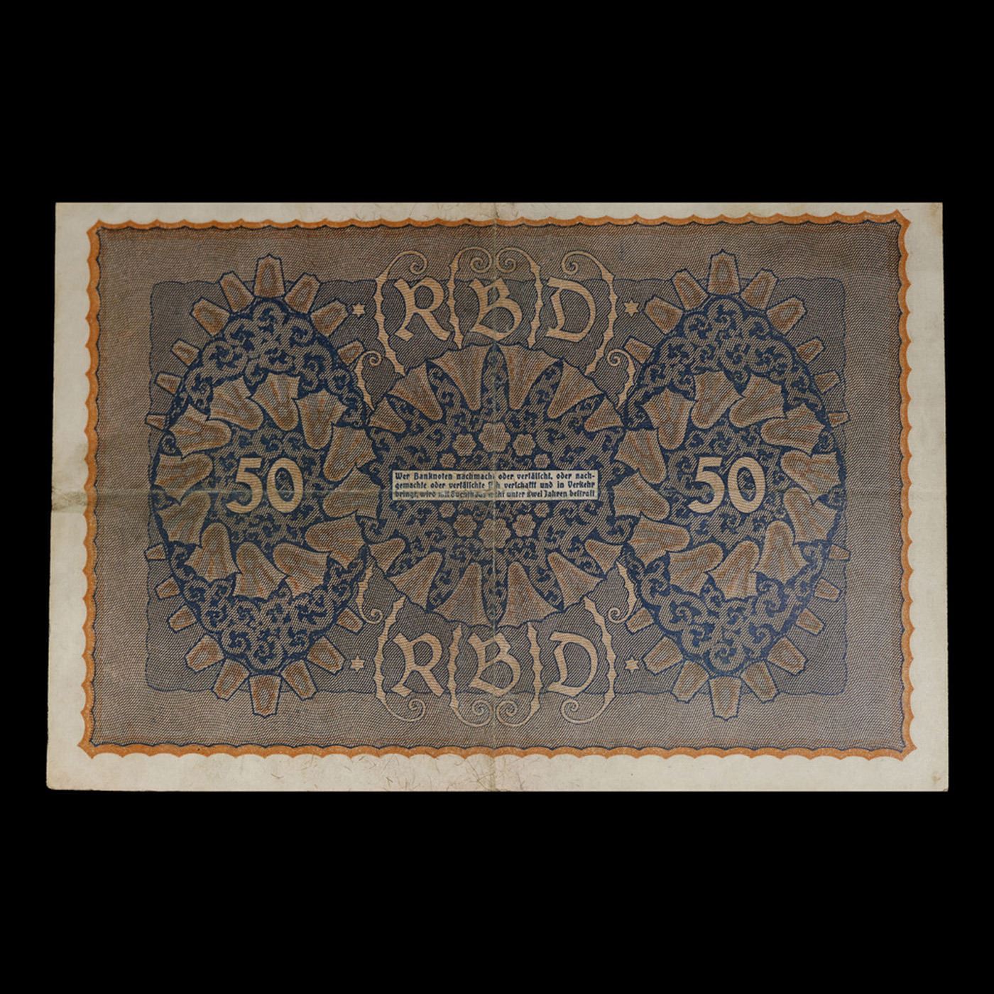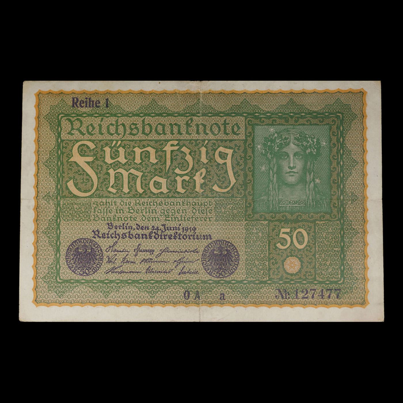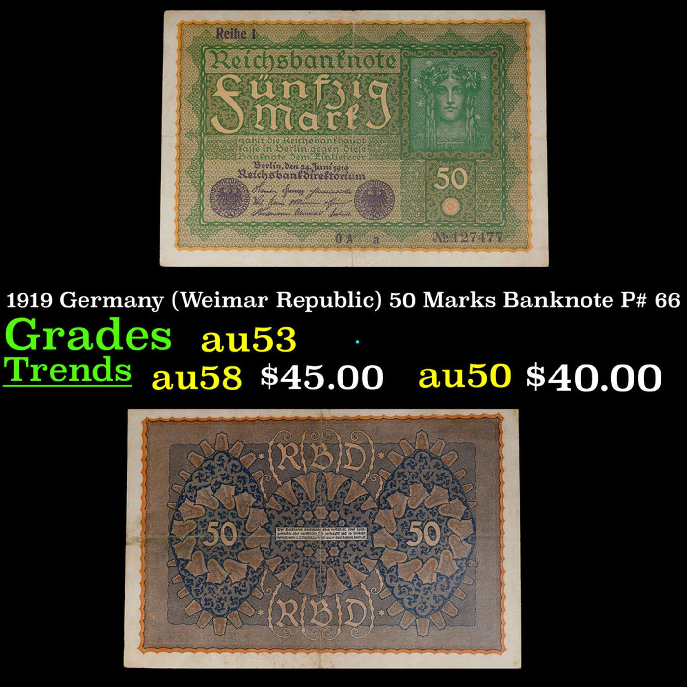 1919 Germany (Weimar Republic) 50 Marks Banknote P# 66 Grades Select AU. In August 1914, Directly after the onset of WW1, the German Empire removed the gold backing of the mark and issued new currency. After the fall of the German Empire in 1918, the newly formed German Weimar Republic issued another new currency, known derisively as the "Paper Mark", which faced massive hyperinflation.