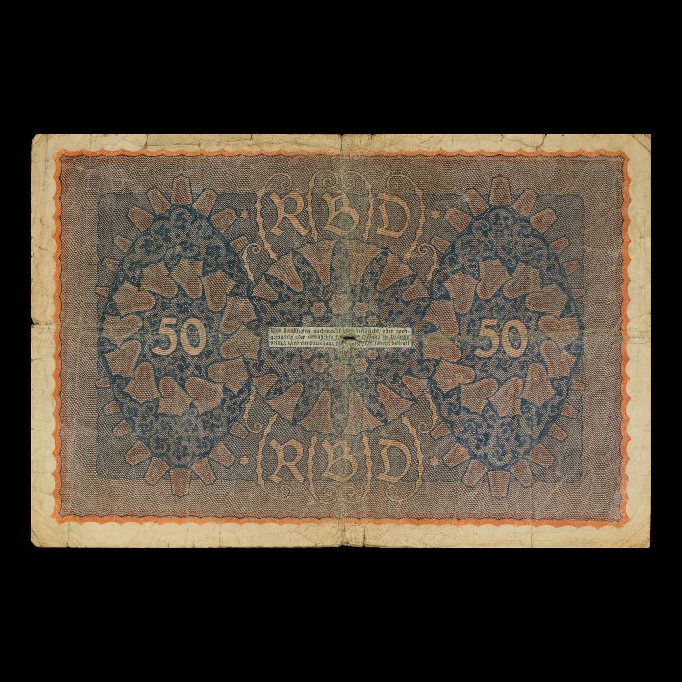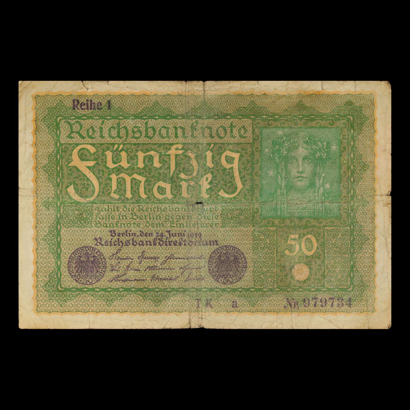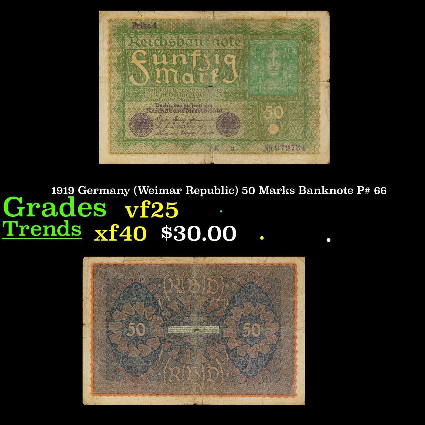 1919 Germany (Weimar Republic) 50 Marks Banknote P# 66 Grades vf+. In August 1914, Directly after the onset of WW1, the German Empire removed the gold backing of the mark and issued new currency. After the fall of the German Empire in 1918, the newly formed German Weimar Republic issued another new currency, known derisively as the "Paper Mark", which faced massive hyperinflation.