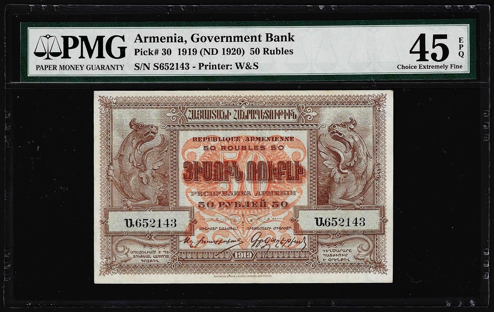One 1919 Government Bank Armenia 50 Rubles Note Pick# 30 PMG Choice Extremely Fine 45EPQ. PMG Certified.