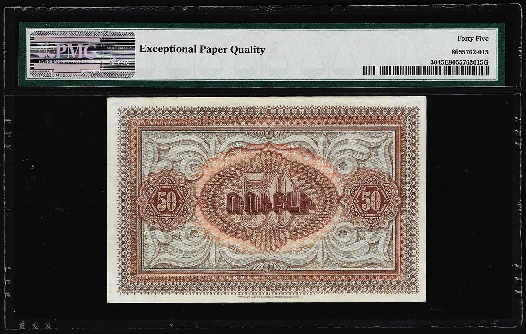 One 1919 Government Bank Armenia 50 Rubles Note Pick# 30 PMG Choice Extremely Fine 45EPQ. PMG Certified.