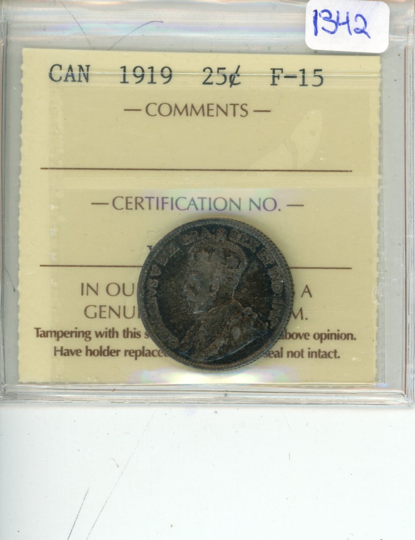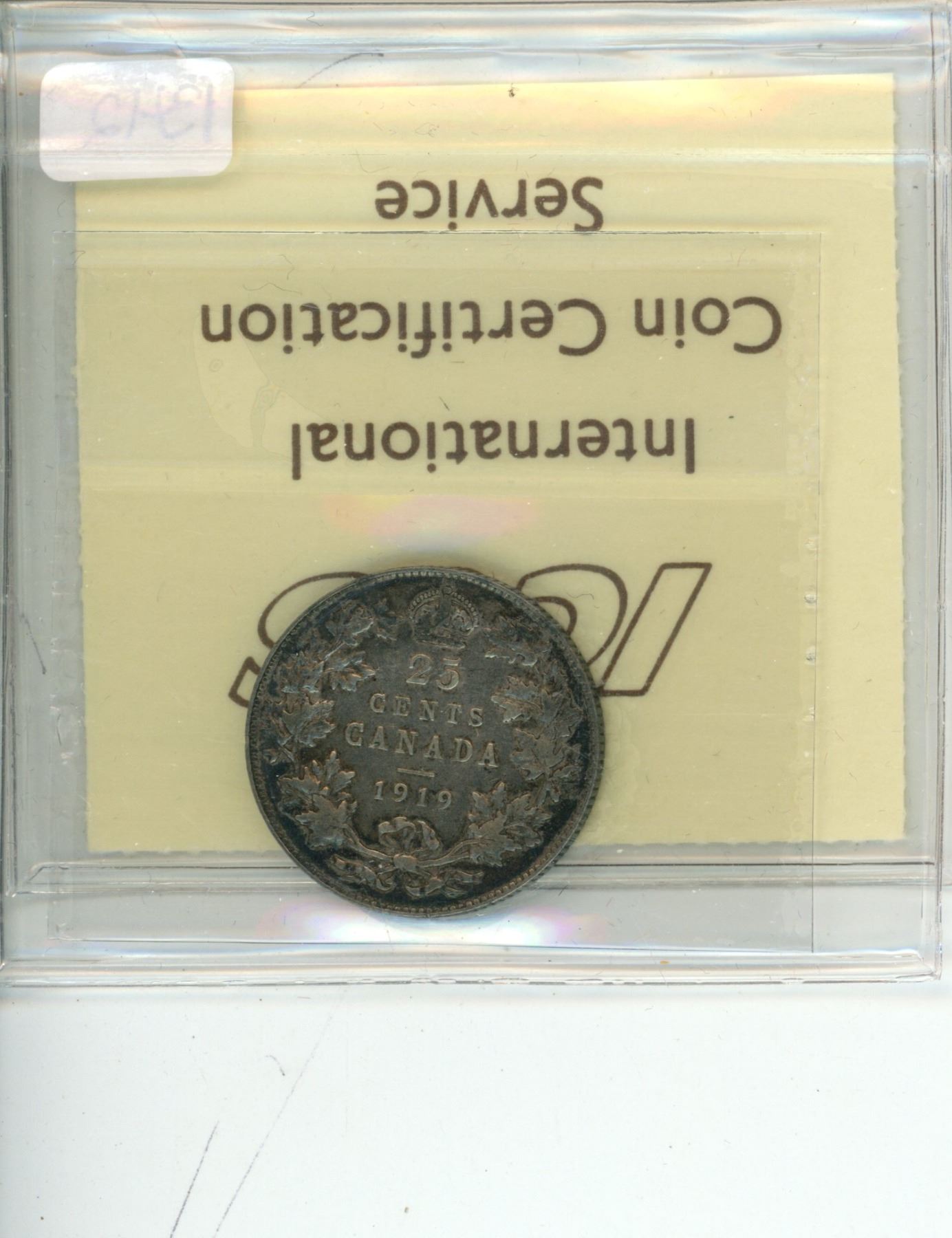 1919 ICCS graded, Canadian silver 25 cent coin - F15