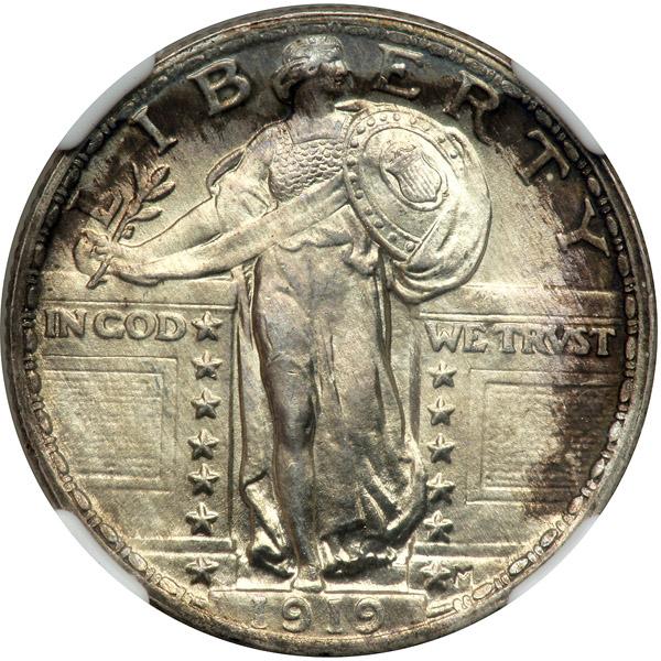 1919 Liberty Standing Quarter Dollar. NGC graded MS-65+ Full Head. Boldly struck with gorgeous antique obverse toning on the borders. Luster is outstanding! Pop 1, the only plus grade for the date in FH.