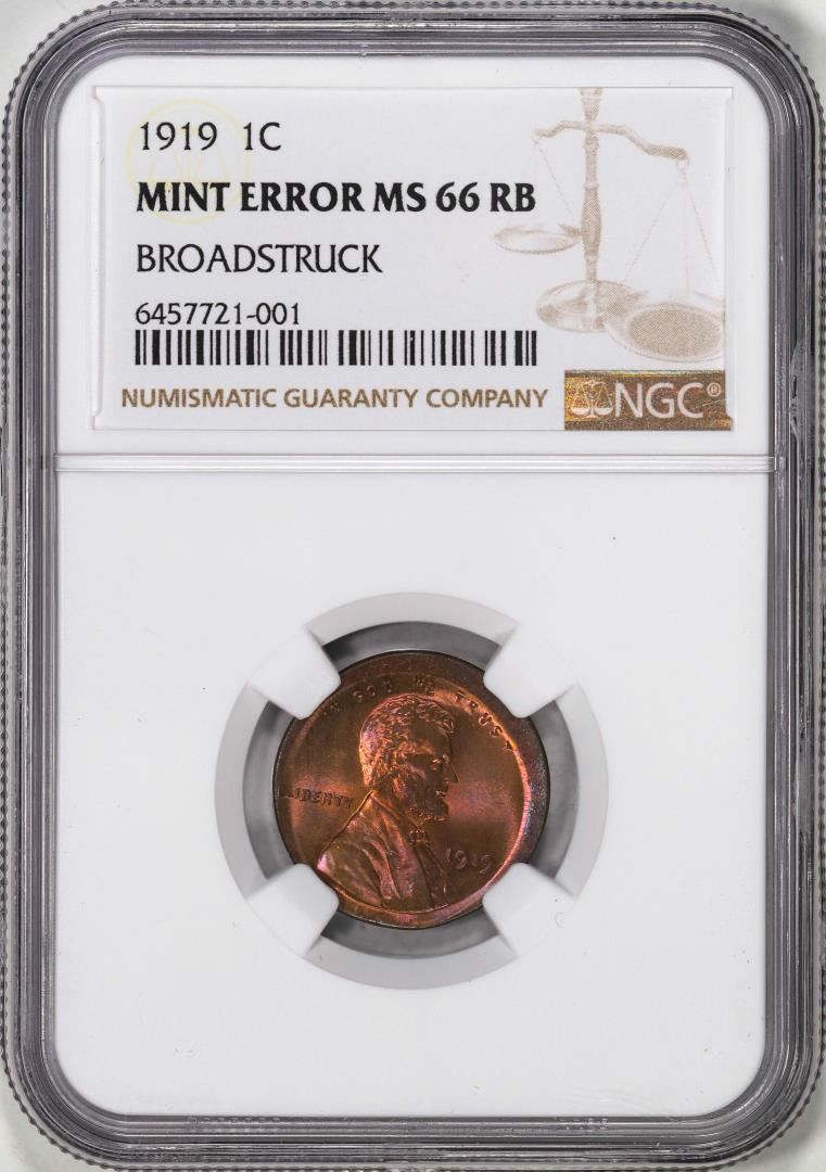One 1919 Lincoln Memorial Cent Mint Error Broadstruck Coin NGC MS66RB Great Color. NGC Certified.