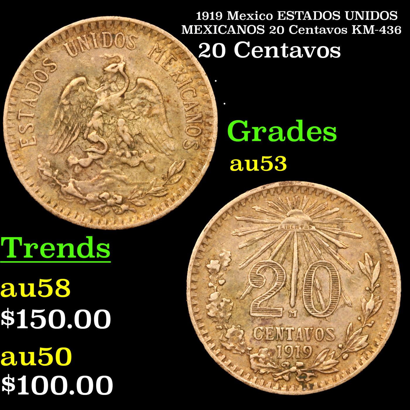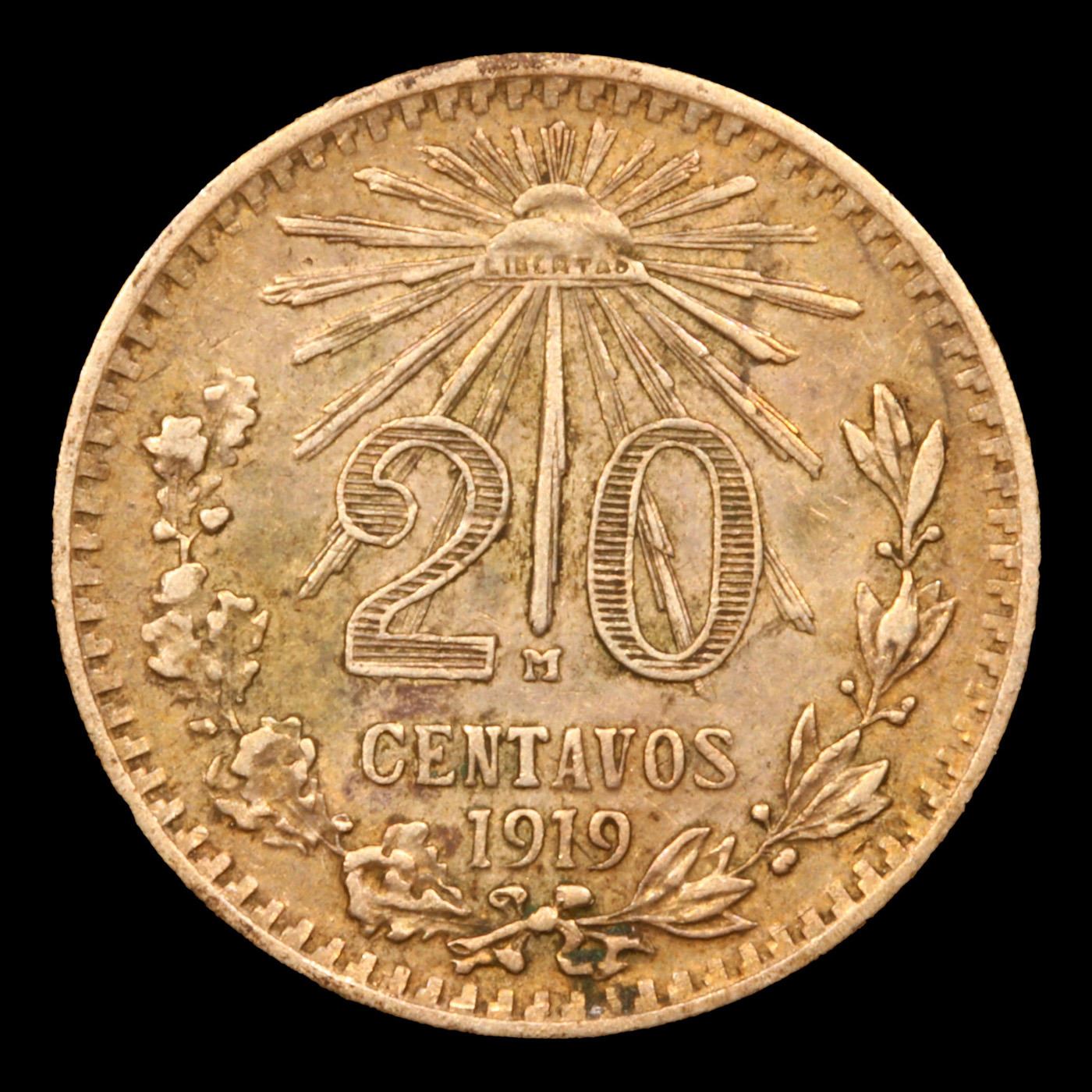 1919 Mexico ESTADOS UNIDOS MEXICANOS 20 Centavos KM-436 Grades Select AU.