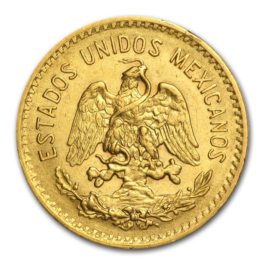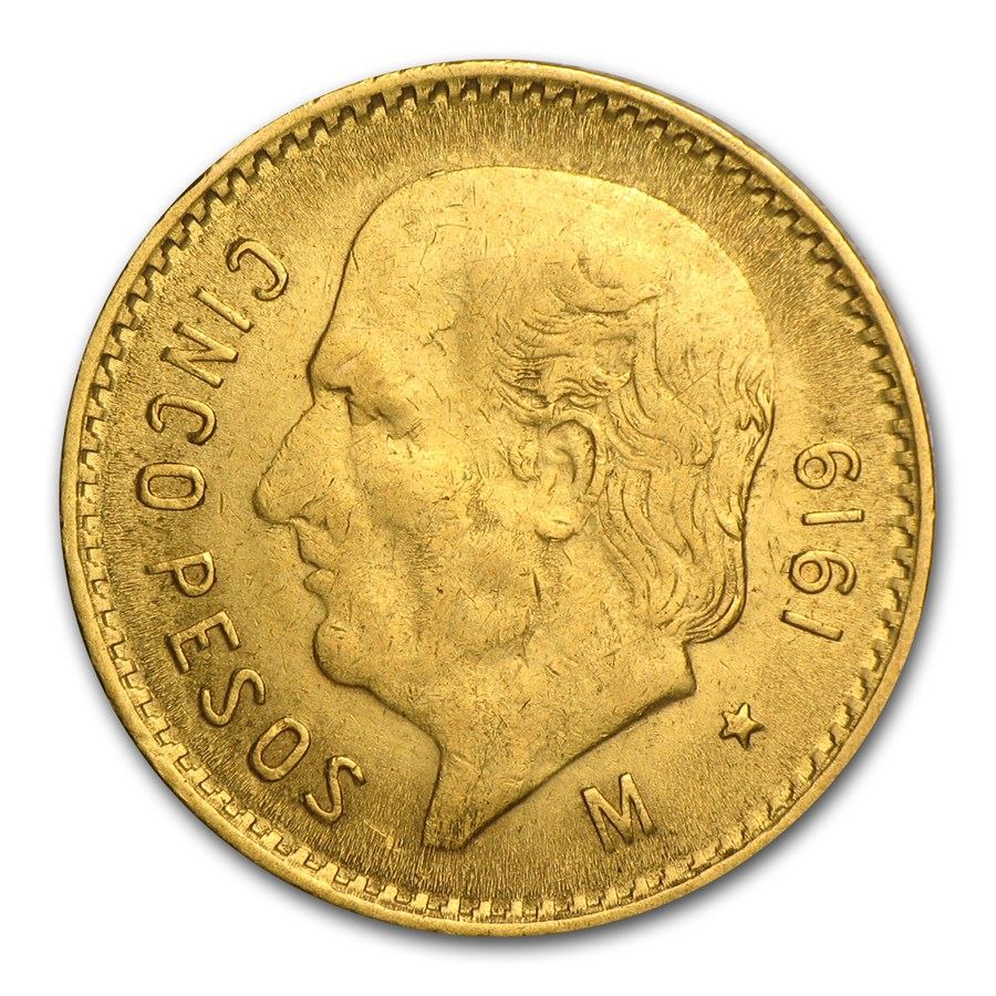 1919 Mexico Gold 5 Pesos. This coin depicts the Mexican hero, Miguel Hidalgo y Costilla. This gold coin contains .1205 of an ounce. This coin is a regular dated issue, and not a restrike.