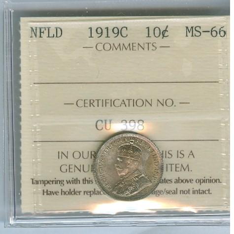 1919 Nfld 10¢ ICCS MS66, superb example. Superbly toned with great luster! A killer!