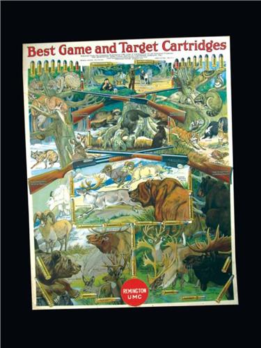 1919 Remington UMC Best Game and Target Cartridges Paper Poster. Original bands top and bottom. Excellent original condition. Image 20 X 26 inches.
