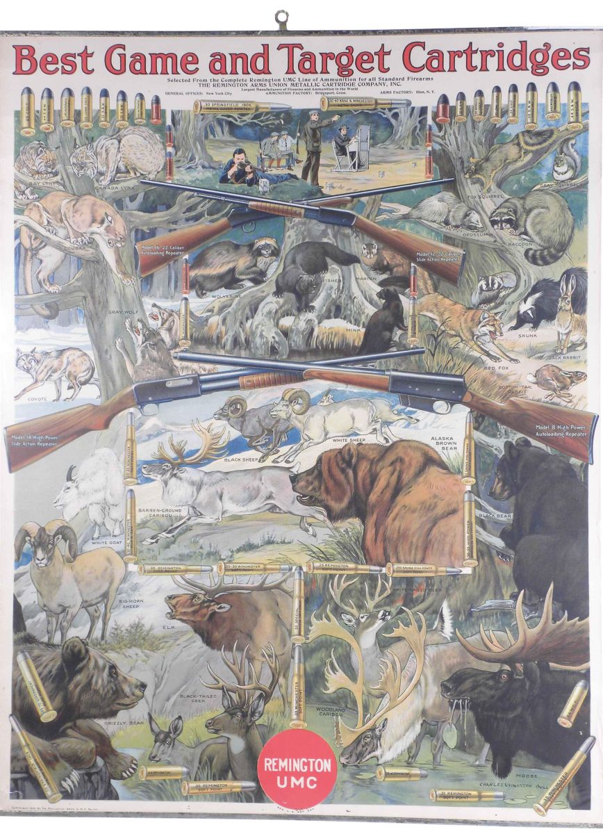 1919 Remington UMC Best Game and Target Cartridges, paper poster. Original bands top and bottom. Excellent original condition. 20 X 26 1/2 inches. Start Price $50