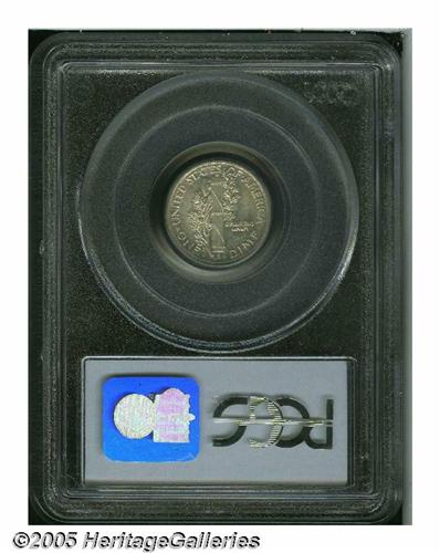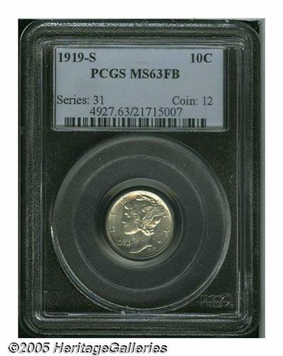 <B>1919-S<10C> MS63 Full Bands PCGS.</B></I> Silver-gray surfaces display wisps of light tan on the reverse, and a couple splashes of pale violet on the obverse. The design elements are sharply struck. A shallow scrape on Mercury's jaw and a couple of pinscratches on the neck limit the grade.