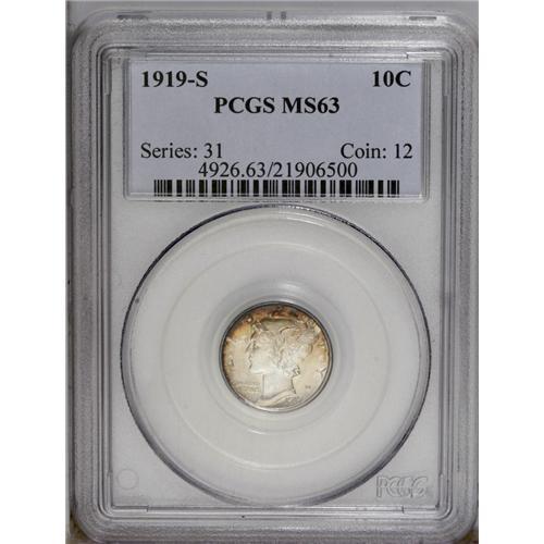 1919-S 10C MS63 PCGS. Mostly brilliant silver surfaces 1919-S[10C] MS63 PCGS.