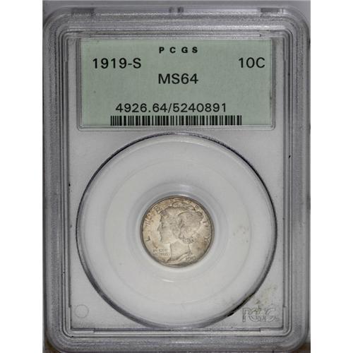 <B>1919-S 10C MS64 PCGS.</B></I> Pearl-gray and golden-brown colors confirm the originality of this satiny and undisturbed near-Gem. The central bands are nearly fully split, but the separation is not quite complete. In a green label holder.